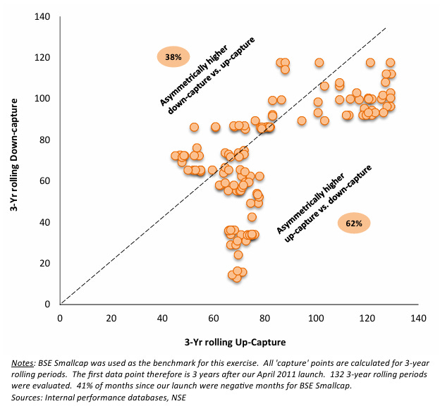 A rolling period plot of ‘Up’ vs ‘Down’ capture, particularly in case of long-tenured strategies, is generally a reasonably sound way of interpreting ‘capture’ metrics fairly (by taking an un-skewed look), vs. a standard since-inception measure of up-down capture. A mostly favorable rolling up-down capture often establishes consistency in underlying style. For instance, while Minerva India Under-served has since-inception ‘up capture’ of 81 and a ‘down capture’ of 68, this by itself doesn’t confirm whether our favorable up-down capture differential was skewed (or not) by certain periods. By itself, it fails to establish consistency. To address that, the attached exhibit plots our 3-year rolling ‘down capture’ (on y axis) vs. ‘up capture’ (on x axis) - The most telling strategy characteristic is that 62% of all observations over nearly 14 years of allocation fell in the asymmetrically high ‘up capture’ region (i.e. higher up-capture and lower down-capture) of the plot.
