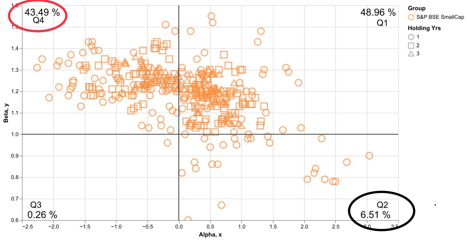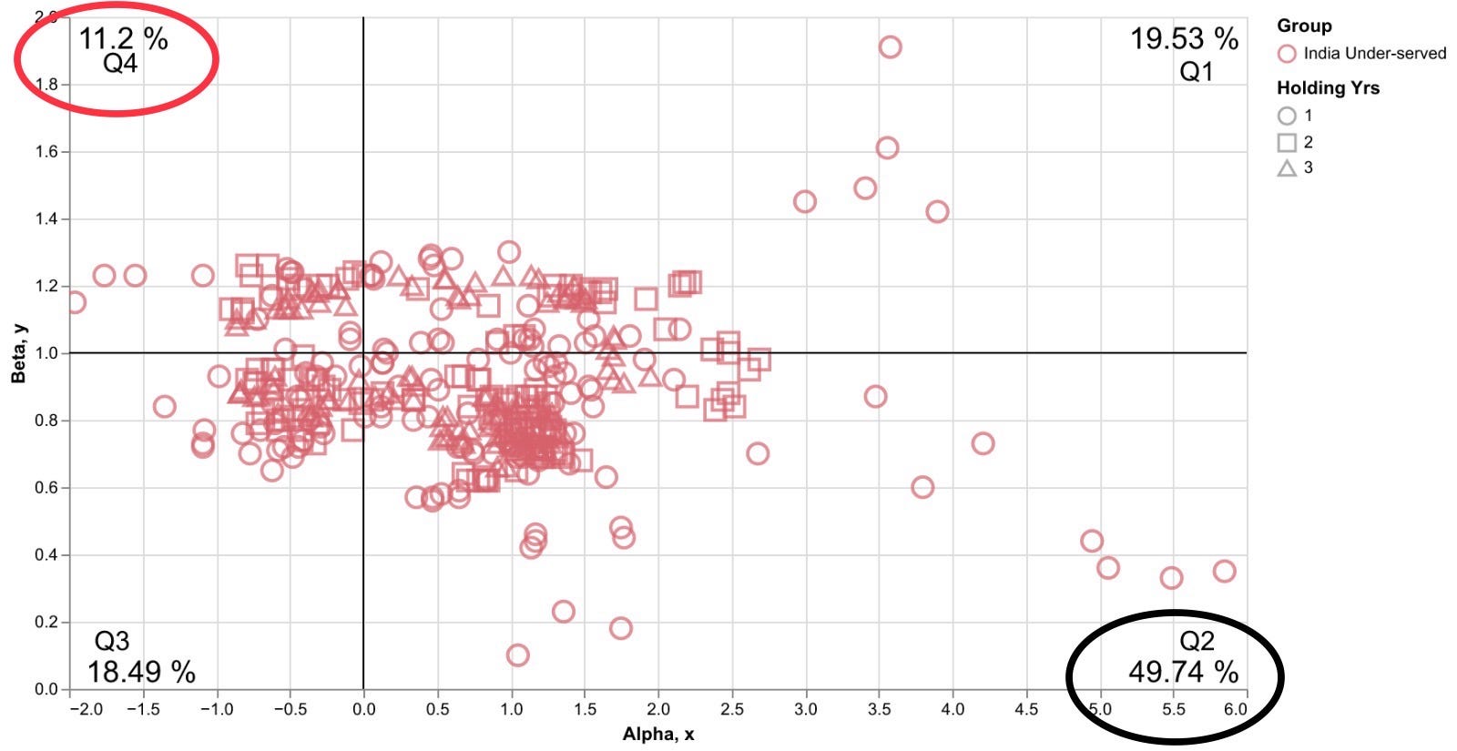 The biggest challenge for discerning allocators is to differentiate between skill and luck while evaluating past performance. Systemic attribution is critical in evaluating potential sustainability of performance. AlphaBlock performs quarterly simulations for Minerva India Under-served vs BSE Smallcap (using BSE 500 as the benchmark for both) for 1, 2, and 3 year holding periods (based on our since-inception data). In this post, we share Cartesian charts that show ‘’Alpha’ vs ‘Beta’ scatter plots. It is a nuanced approach to identify inherent skill in investment performance. Each plot is broken into four quadrants to help visualize distribution of outcomes.