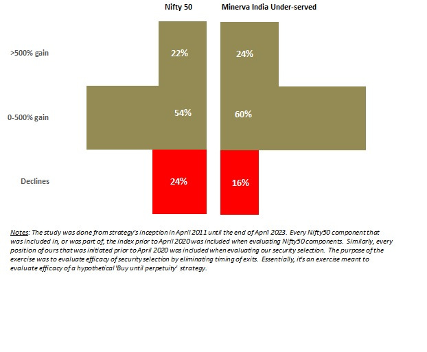 The results confirm that, in sharp contrast to deeply entrenched beliefs around smallcaps, our return distribution is significantly more favorable than that of Nifty50. Over 12+ years of deploying capital in India, not only have we identified more multi-baggers than Nifty50, but more importantly, just about 16% of our holdings have reported declines (from our entry until the end of April 2023, regardless of whether we exited the position or not), vs. nearly 1/4th of all Nifty50 components.