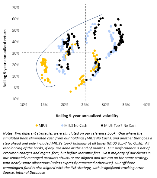While all books make a compelling case to get on most efficient frontiers, it is worth questioning if elevated volatility in such simulations was worth it. If (!!) an allocator has the patience to invest over long timeframes, it is hard to argue against a full allocation into strategy’s highest conviction (defined here as top-7 positions by weight) holdings i.e. the third choice referenced above - In majority (not all!) of the 5-year periods, this simulated strategy delivered the highest Information Ratios, with the strategy compounding at nearly 33% over decade and a half, vs. 17% for the Minerva India Under-served strategy and 12% for BSE Smallcap. That said, as is evident (refer to the black dots on the right of the exhibit), there are multiple 5-year periods when this simulated ‘Top-7 No Cash’ strategy would have had annualized volatility of >30%. Clearly, this would have been a stiff test of patience, which is often in short supply in India.